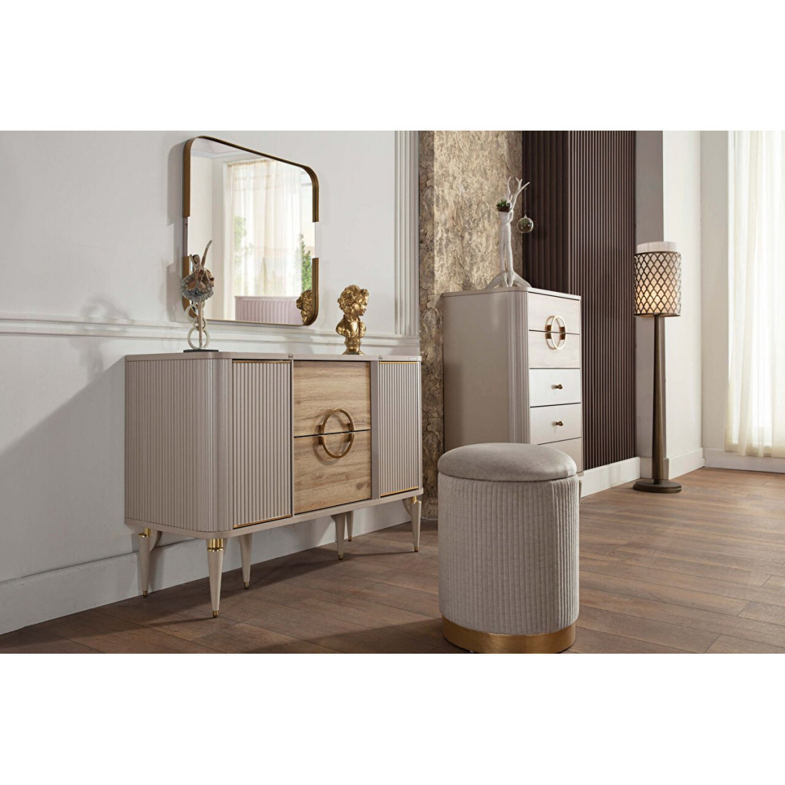 Туалетный столик Санвито SANV-23 один из элементов турецкой коллекции SANVITO. Прекрасное дополнение интерьера спальни, гостиной, залы. Столик обладает сравнительно небольшими размерами 1,170 мм x 470 мм x 830 мм. Может использоваться как дамский столик или как комод. Имеет два больших вместительных выдвижных ящика по центру, и полки для хранения за дверцами фасадов. Кремовый оттенок фасадов, наряду с рифленой  поверхностью комбинируется с древесной фактурой ящичков. Оригинальный дизайн и теплые, нежные тона в сочетании с функциональностью столика-комода Санвито SANV-23 делают его изящным и привлекательным.