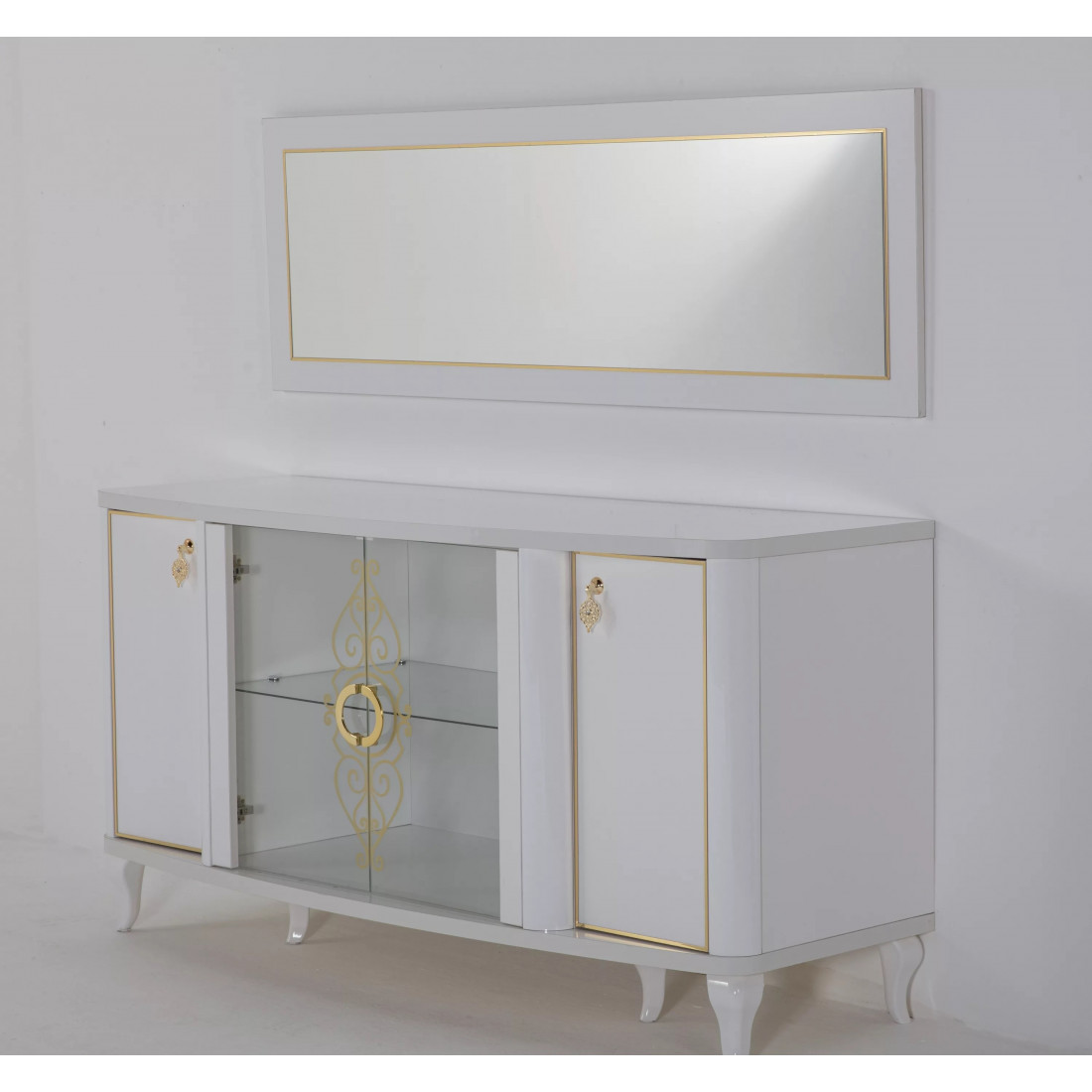 Зеркало для буфета "Легенда" обладает элегантным утонченным стилем. Оно представлено в виде прямоугольного основания и такого же прямоугольного зеркала с декоративной золотой отделкой. Благодаря такому минимализму, изделие можно использовать не только вместе с буфетом, оно прекрасно впишется и как отдельный предмет интерьера практически в любую комнату.